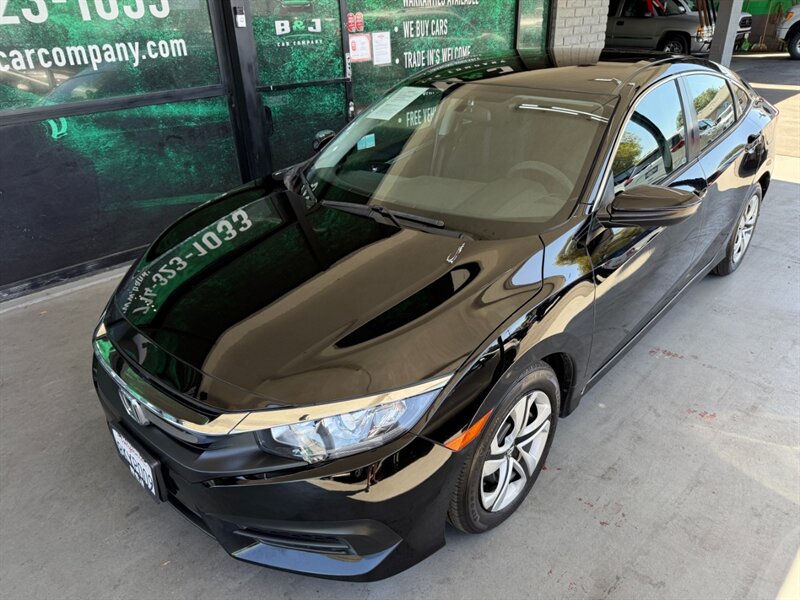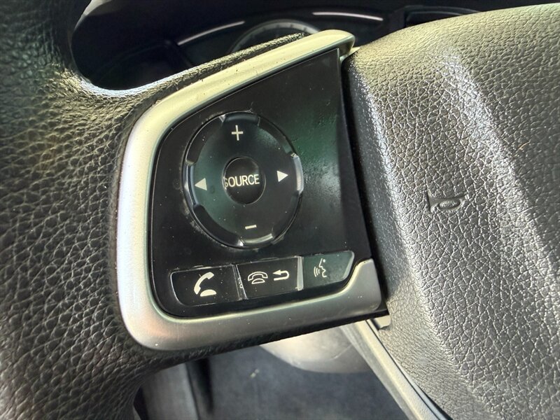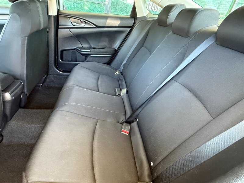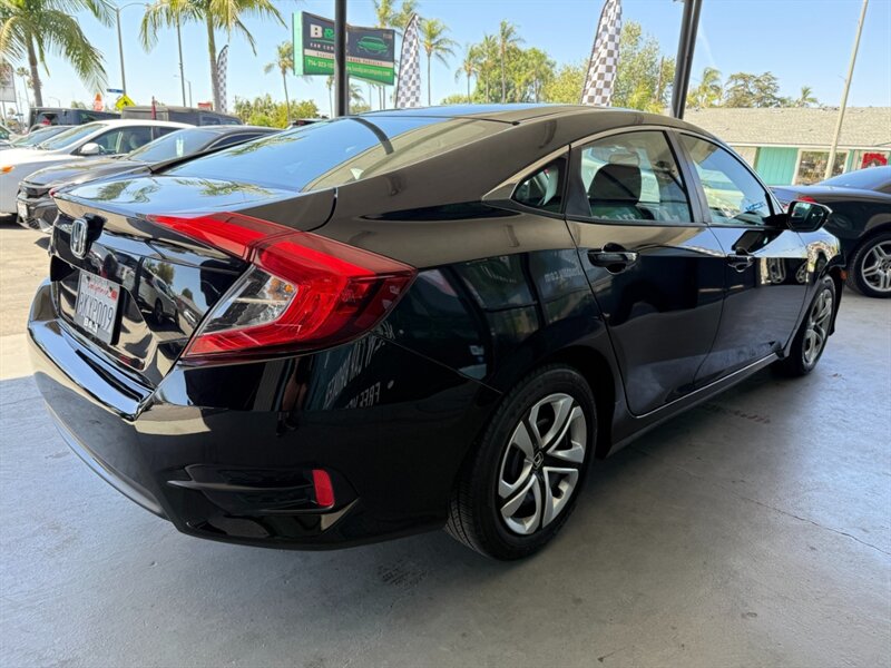 2018 Honda Civic LX in black with a black cloth interior, powered by the factory 2.0L I4 and in excellent overall condition. Factory-standard equipment includes Bluetooth HandsFreeLink and audio streaming, USB and auxiliary inputs, a multi-angle rearview camera, steering-wheel audio and phone controls, cruise control, and automatic climate control. Comfort and convenience features include cloth seats with a 60/40 split-folding rear bench, power windows and locks, and remote keyless entry; exterior features include 16-inch steel wheels with covers and daytime running lights. Standard safety systems comprise ABS, traction control, Vehicle Stability Assist (VSA), multiple airbags, and a tire-pressure monitoring system.